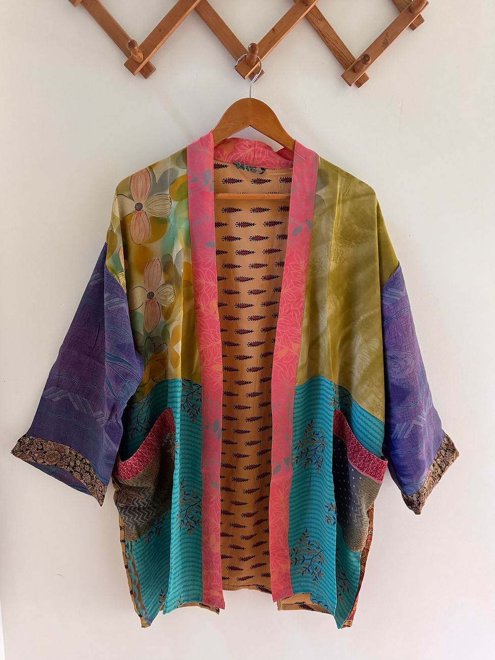 Each one of our blockprint, embroidery or kantha pieces comes to you packaged with love in its own matching tote bag, or a recycled silk bag used from remnants of vintage Indian saris. We use off cuts of the clothing we make so the bag is dependant on what we have available to be used!