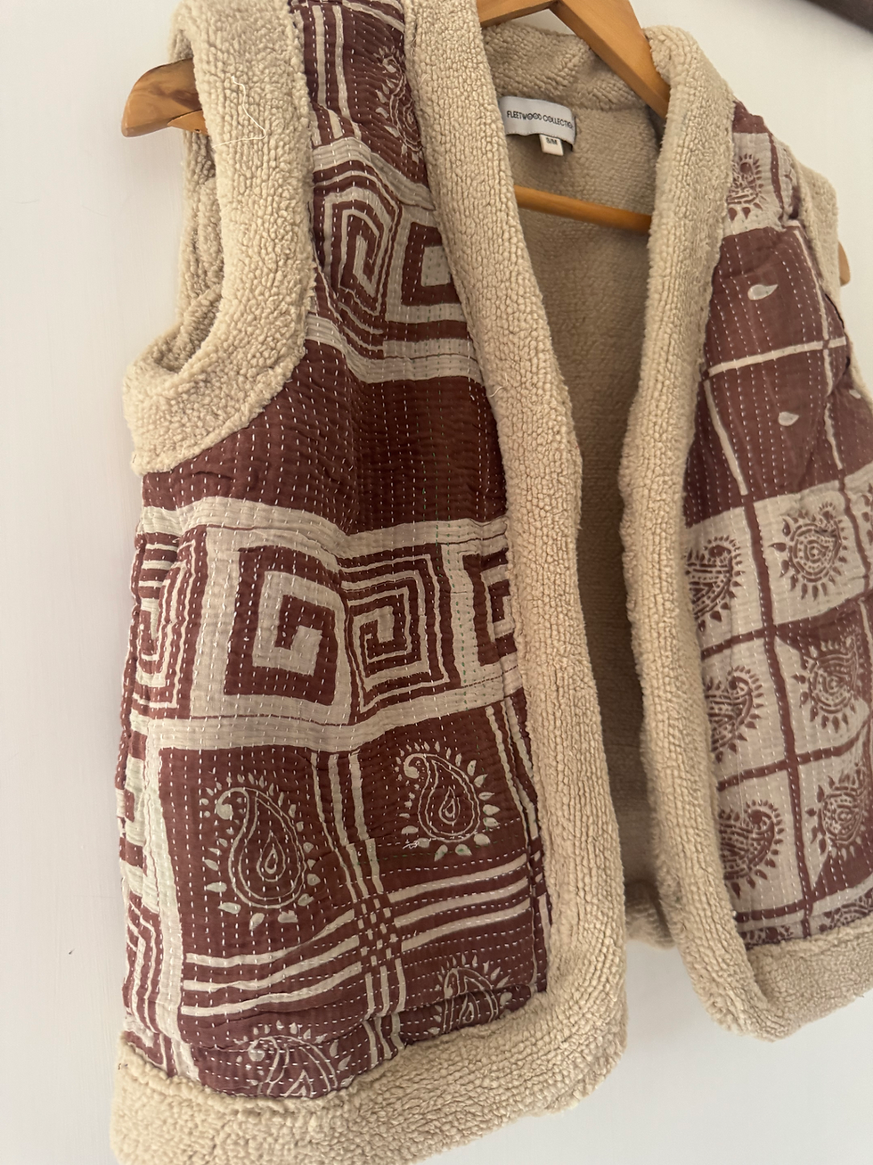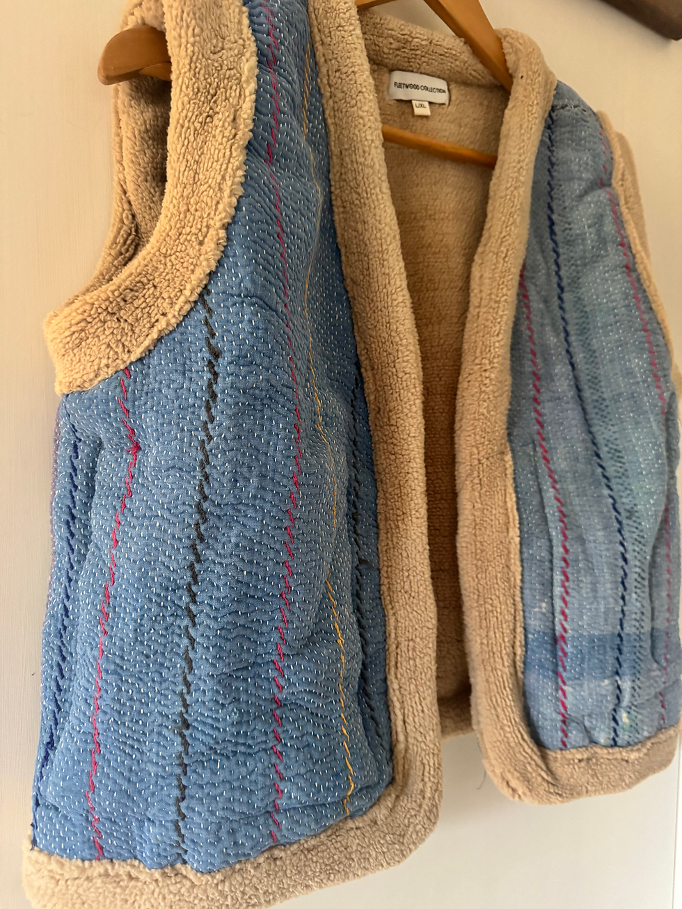 Kantha is a form of traditional indian embroidery whereby pre-loved cotton saris or blankets are hand sewn with a running stitch by women from local villages. The term 'kantha' is the stitch which is always unique in its form and layers because it is all hand done. Each side is different, meaning that your piece will have 2 unique sides and behold different patterns and colours. They are perfectly imperfect and the epitome of upcycling. We hand pick from these vintage kantha and then our small team of artisans will tailor them into the pieces that we design whether that be market totes or jackets.